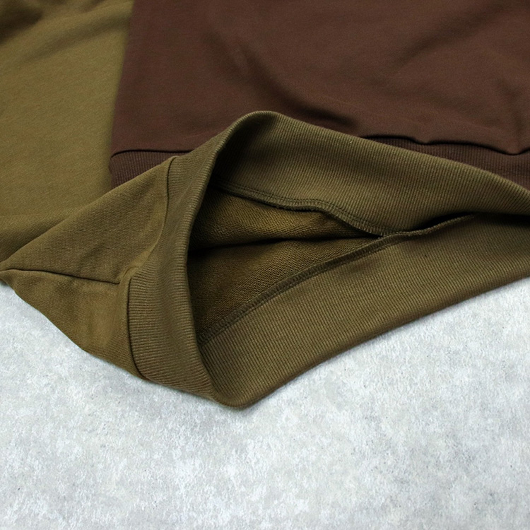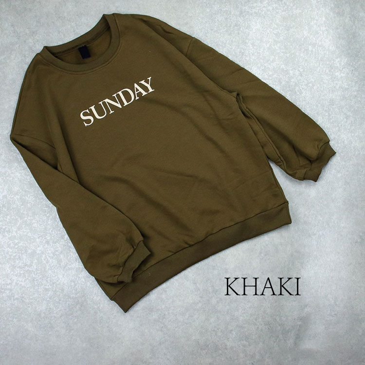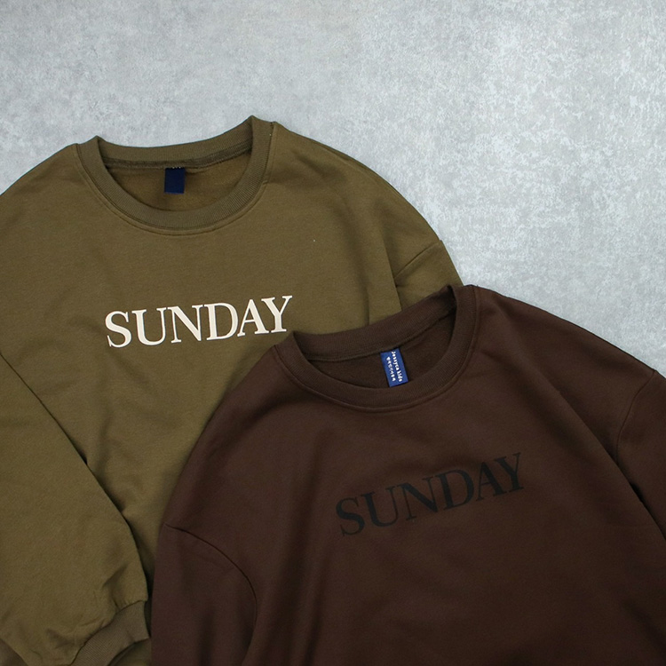 落ち着いたカーキとブラウンの2色展開で、胸元に日曜日の文字がおしゃれにプリントされています。
