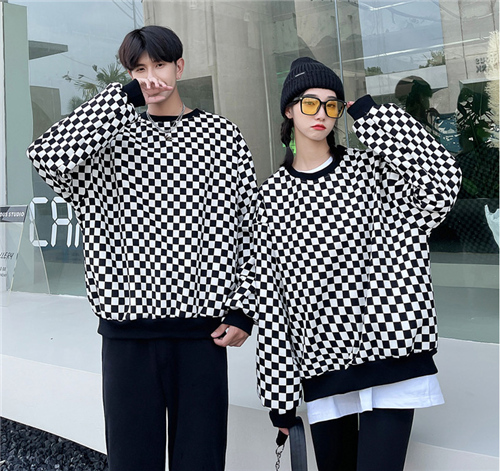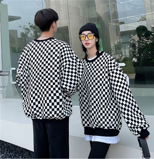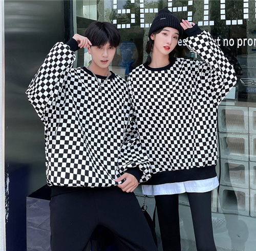 ペアルック 夫婦カップル向け白黒市松模様トレーナー